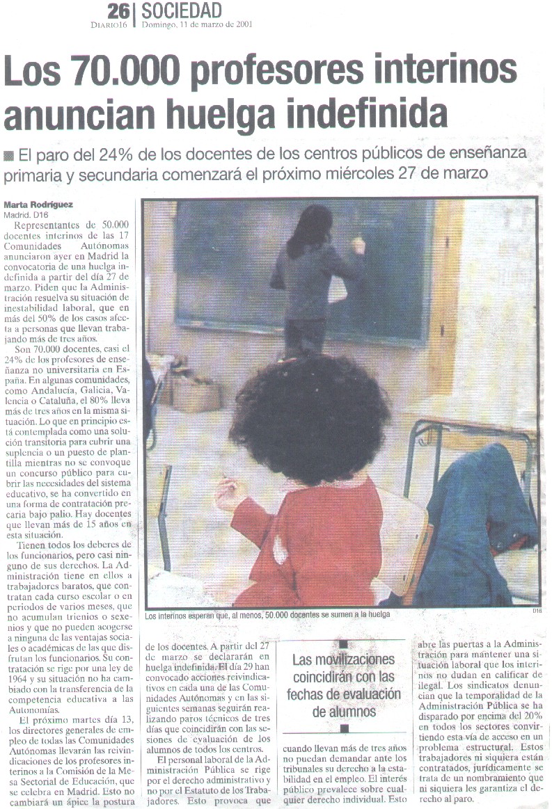 A TODOS LOS PROFESORES: DESOIGAMOS LOS CANTOS DE SIRENA 23/IV/2005 HUELGA Y ASAMBLEA ESTATAL 29/4/2004 NOTA INFORMATIVA.MANIFESTACIÓN 24/XI/2003 COMUNICADO Y ACCIONES 6/XI/2003 REUNIÓN ESTATAL 25/X/2003 SEGUIMOS EN HUELGA 17/V/2002 PROXIMA MANIFESTACION DE LOS TRABAJADORES EN PRECARIO 15/XII/2001 COMUNICADO DE LA PRÓXIMA REUNIÓN 6/XII/2001 ACUERDOS DE LA REUNIÓN 20/X/2001 NOTA DE LA REUNIÓN 1/IX/2001 RESPUESTA DE PRESIDENCIA DE GOBIERNO 2/VI/2001 HUELGA INDEFINIDA Y MANIFESTACIÓN 10/V/2001 CARTA A LA SRA. MINISTRA 3/V/2001 CONTINÚAN LAS MOVILIZACIONES 10/IV/2001 INTENTO ILEGAL DE AMPLIAR LOS SERVICIOS MÍNIMOS. GALICIA 3/IV/2001 INFORMACIÓN DE LA REUNIÓN ESTATAL 31/III/2001 ENTREVISTA ENSENET 18/III/2001 SOBRE HUELGA INTERINOS. DIARIO16 11/III/2001 COMUNICADO Y CONVOCATORIA DE HUELGA 10/III/2001 COMUNICADO 27/II/2001 NOTA DE PRENSA SOBRE APLAZAMIENTO DE REUNIÓN 15/II/2001 CARTA AL PRESIDENTE DEL GOBIERNO 31/I/2001 CARTA ABIERTA A JESÚS CABALLERO 26/I/2001 COMUNICADO 8/I/2001 OPINIÓN DEL CONSEJO ESCOLAR 2001 CREACIÓN MASIVA DE PUESTOS DE TRABAJO. APORTACIÓN 9/IX/2000 CARTA AL PRESIDENTE DEL GOBIERNO 18/VIII/2000 ACUERDOS DE LA REUNIÓN ESTATAL EN VALENCIA 25/III/2000 NOTA INFORMATIVA SOBRE MOVILIZACIONES 12/III/2000 PRÓXIMAS ACCIONES 26/II/2000 PETICIÓN DE CONCENTRACIÓN AL DELEGADO DEL GOBIERNO 24/II/20000 SIN COMENTARIOS 16/II/2000 UNIDAD DIDÁCTICA SOBRE EL DERECHO A HUELGA 30/I/2000 LUCHANDO EN TODO EL ESTADO 27/I/2000 COMUNICACIÓN DE HUELGA AL MINISTRO DE EDUCACIÓN 18/I/2000 ACUERDOS DE LA REUNIÓN 12/II/2000 NOTA INFORMATIVA 24/II/2000 NOTA INFORMATIVA DE LA REUNIÓN 9/IX/2000 ENTREVISTA MEC Y MAP 4/IV/2000 REUNIÓN ESTATAL. CONVOCATORIA DE PARO 15/I/2000 NOTA DE PRENSA. SITUACIÓN Y POSTURAS DE LAS CCAA 7/II/2000 NOTA DE PRENSA 10/II/2000 PROXIMA REUNIÓN 17/X/2000 DECLARACIÓN DE LA COORDINADORA ESTATAL 19/XII/1999 APOYO A CANARIAS 18/XII/1999 CARTEL CONCENTRACIÓN 19/VI/1999 NOTA INFORMATIVA. ENTREGA DE FIRMAS 19/VI/1999 CARTA AL MINISTRO 24/IV/1999 REIVINDICACIÓN EXTREMEÑOS 17/III/1999 EL FRACASO DE LA REUNIÓN DE LA MESA SECTORIAL 14/VI/1998 CARTA SRA. MINISTRA 30/V/1998 NUEVAS OPOSICIONES. NUEVOS DESPIDOS. A PADRES Y ALUMNOS 11/V/98 COMUNICADO DE PRENSA 6/V/1998 COMPRENDER LA SITUACIÓN GENERAL 26/IV/1998 EXTRAIGAMOS EXPERIENCIAS 15/IV/1998 ANÁLISIS DE LA HUELGA 26/III/1998 A LA ATENCIÓN DE LOS PROFESORES DE CASTILLA LEÓN 24/VI/1998 RECURSO A LA CONVOCATORIA DE OPOSICIÓN 5/V/1998 HUELGA. MANIFESTACIÓN 29/I/1997 COMUNICADO AL SECTOR EDUCATIVO Y A LA OPINIÓN PÚBLICA 25/IX/1996 CARTA A LOS SEÑORES DIPUTADOS 26/VI/1996