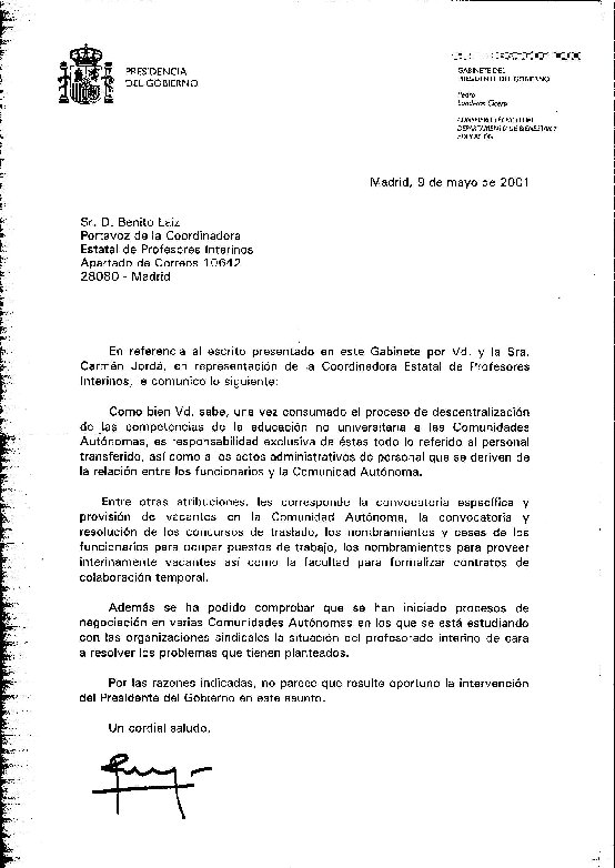 · El contenido de la carta obvia, para intentar desentenderse del tema, las competencias estatales, que son las básicas que el Estado tiene en este asunto, intentando pasar al tema a las Comunidades, a la vez que les está diciendo, de alguna manera, que no les están haciendo las cosas muy bien - desde una perspectiva de Estado-. No es casualidad que al poco tiempo, como ya sabéis, se haya lanzado desde la Presidencia de la Comunidad Valenciana un "balón", no sabemos si de oxígeno o de dinamita que dice va a bordar el problema de la precariedad de los 27.000 funcionarios interinos de esa Comunidad. Veremos.